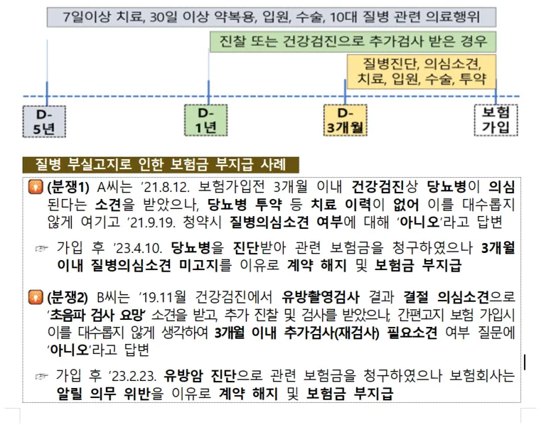 특히 보험 가입시 최근 3개월, 1년, 5년 이내 발생한 의료행위에 대한 정확한 고지*가 필요합니다.