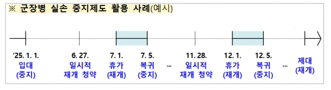 유의할 점은 ①군 복무로 인해 발생한 상해로 중지 기간 중 발생한 의료비는 보장되지 않는 점,