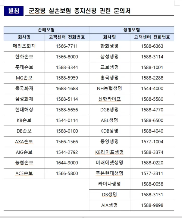 (별첨) 군장병 실손보험 중지 관련 문의처